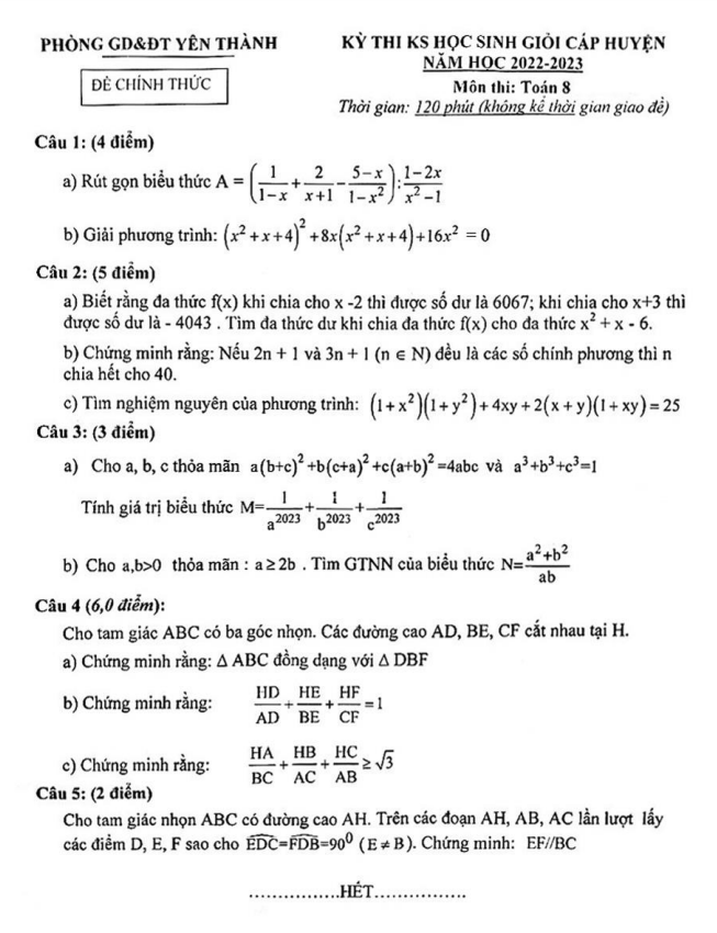 Đề HSG cấp huyện lớp 8 môn Toán năm 2022 2023 phòng GD ĐT Yên Thành Nghệ An
