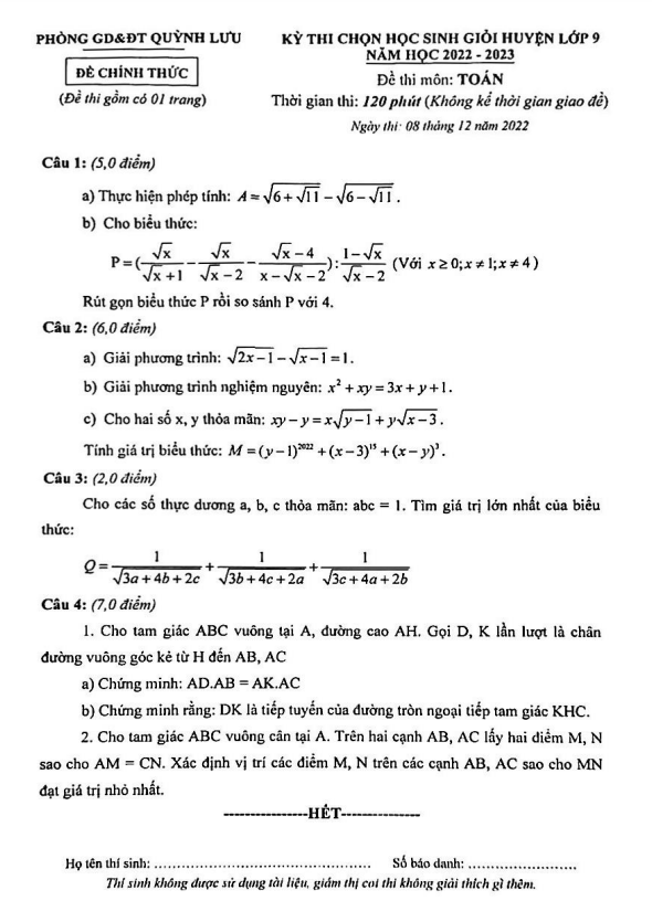 Đề HSG cấp huyện lớp 9 môn Toán năm 2022 2023 phòng GD ĐT Quỳnh Lưu Nghệ An