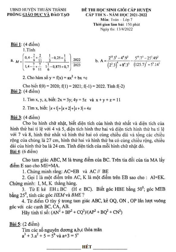 Đề thi HSG huyện lớp 7 môn Toán năm 2021 – 2022