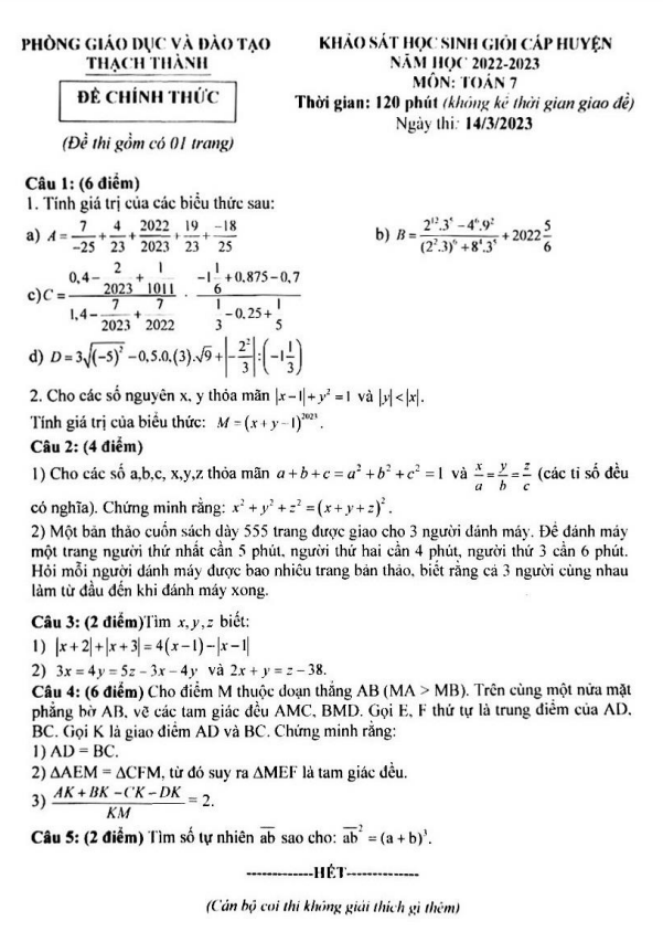 Đề HSG huyện lớp 7 môn Toán năm 2022 2023 phòng GD ĐT Thạch Thành Thanh Hóa