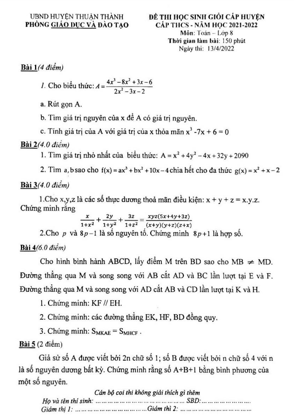 Đề HSG huyện lớp 8 môn Toán năm 2021 – 2022 phòng GD ĐT Thuận Thành Bắc Ninh
