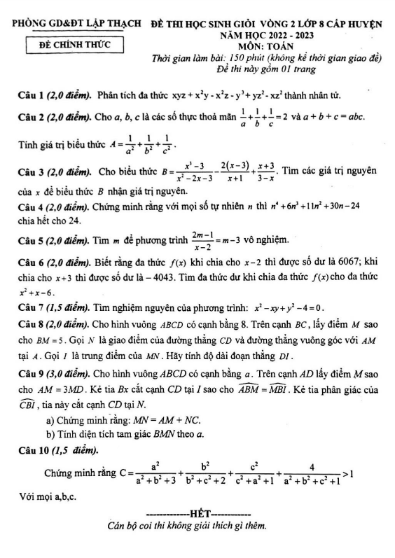 Trích dẫn Đề HSG huyện Toán lớp 8 vòng 2 năm 2022 – 2023 phòng GD&ĐT Lập Thạch – Vĩnh Phúc: