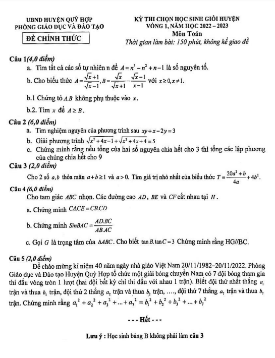 Đề HSG huyện Toán lớp 9 vòng 1 năm 2022 – 2023 phòng GD&ĐT Quỳ Hợp – Nghệ An