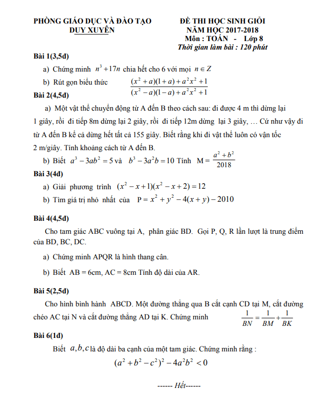 Đề thi HSG Toán lớp 8 năm 2017-2018 phòng GD&ĐT Duy Xuyên – Quảng Nam