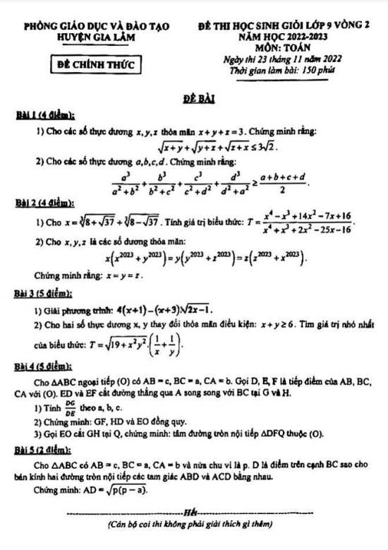 Trân trọng thông báo đến quý thầy cô và các em học sinh lớp 9 về đề thi chọn học sinh giỏi môn Toán lớp 9 vòng 2 năm học 2022 – 2023 do Phòng Giáo dục và Đào tạo huyện Gia Lâm, thành phố Hà Nội tổ chức. Kỳ thi sẽ diễn ra vào ngày 23 tháng 11 năm 2022, hẹn gặp tất cả các em tại địa điểm thi đã thông báo.