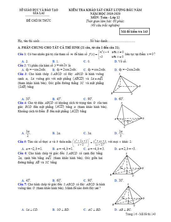 Đề khảo sát chất lượng đầu năm Toán lớp 12 năm 2019-2020 sở GD&ĐT Gia Lai có mã đề thi 143, bao gồm 06 trang với 35 câu hỏi và bài toán dạng trắc nghiệm cho mỗi hệ: hệ GDPT và hệ GDTX. Thời gian làm bài khảo sát là 60 phút. Nội dung kiểm tra thuộc chủ đề kiến thức môn Toán lớp 11 và các kiến thức môn Toán lớp 12 đã học.