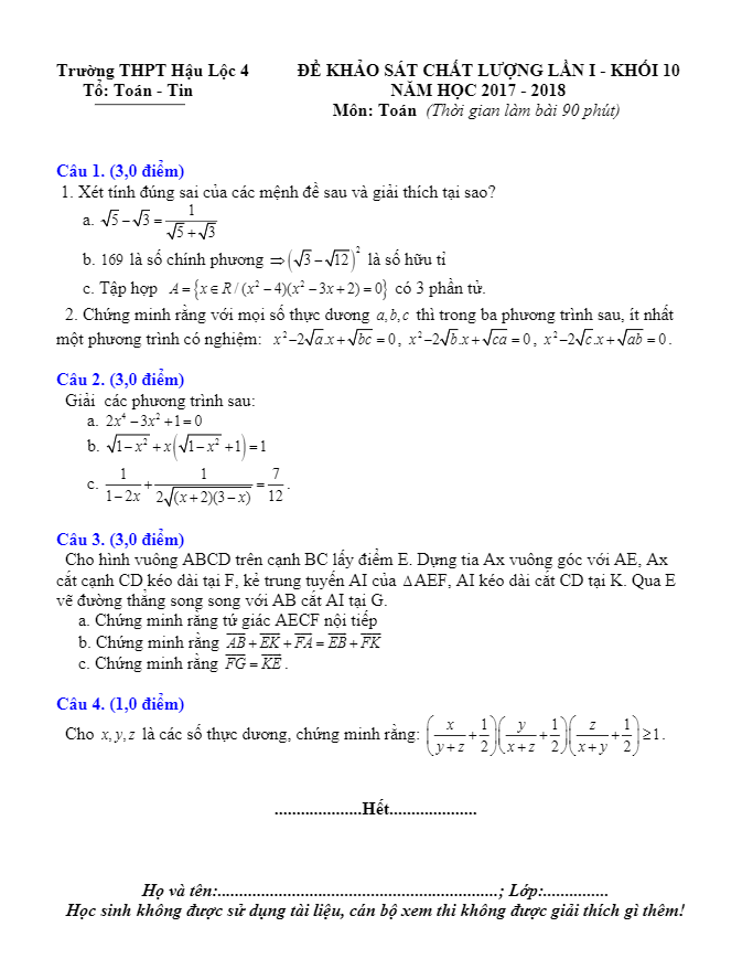 Đề khảo sát chất lượng lớp 10 môn Toán năm học 2017 – 2018 trường THPT Hậu Lộc 4 Thanh Hóa lần 1