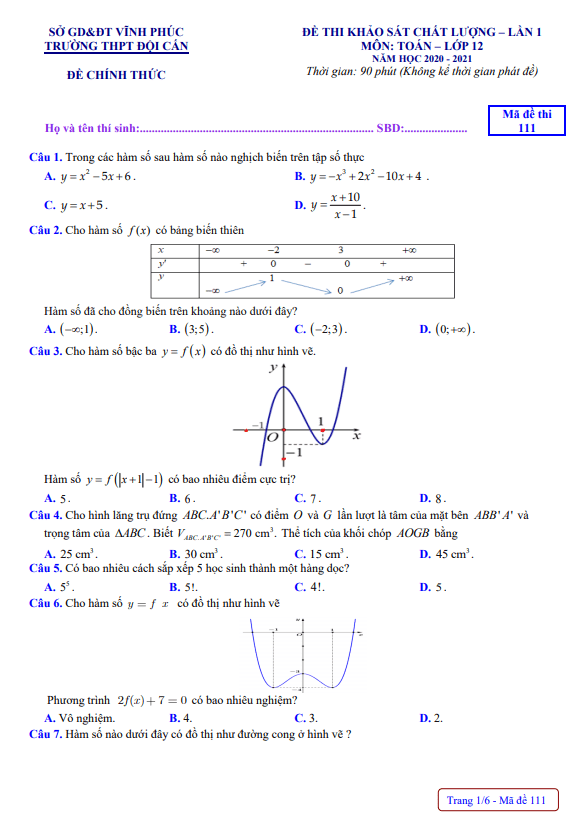 Ngày … tháng 11 năm 2020, trường THPT Đội Cấn, tỉnh Vĩnh Phúc đã tổ chức kỳ thi khảo sát chất lượng môn Toán lớp 12 lần 1 năm học 2020 – 2021. Đề khảo sát chất lượng Toán lớp 12 lần 1 năm 2020 – 2021 trường THPT Đội Cấn – Vĩnh Phúc mã đề 111 bao gồm 06 trang với 50 câu trắc nghiệm, thời gian làm bài 90 phút.