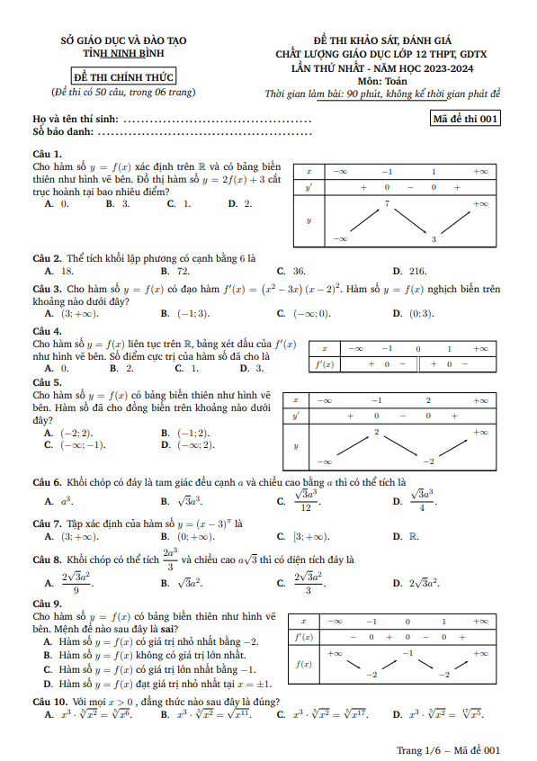 Đề khảo sát chất lượng lớp 12 môn Toán lần 1 năm 2023 2024 sở GD ĐT Ninh Bình