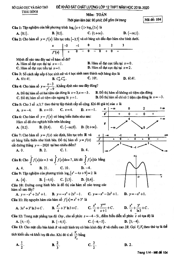 Đề khảo sát chất lượng lớp 12 môn Toán năm học 2019 2020 sở GD ĐT Thái Bình