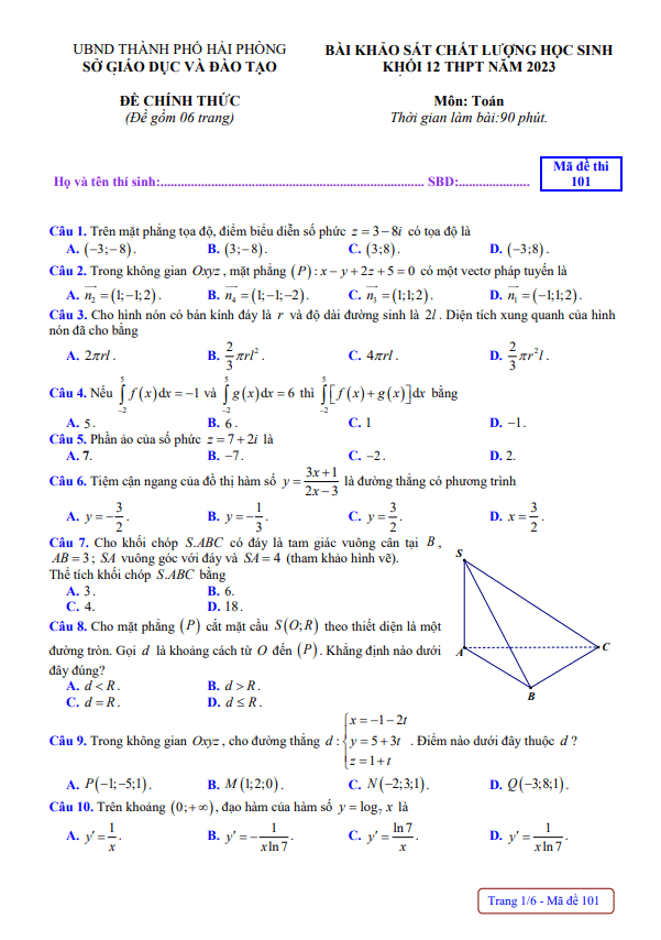 Để chuẩn bị cho kỳ thi tốt nghiệp THPT năm học 2022 – 2023, Sytu xin giới thiệu đến quý thầy cô và các em học sinh lớp 12 đề khảo sát chất lượng môn Toán lớp 12 THPT năm 2023 của sở Giáo dục và Đào tạo tỉnh Hải Phòng. Kỳ thi sẽ diễn ra vào thứ Năm ngày 20 tháng 04 năm 2023, với đáp án mã đề 101, 102, 103, 104, 105, 106, 107, 108.