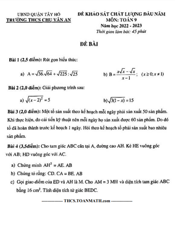 Đề khảo sát chất lượng lớp 9 môn Toán đầu năm 2022 2023 trường THCS Chu Văn An Hà Nội