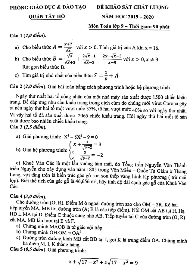 Trích dẫn đề khảo sát chất lượng Toán lớp 9 năm 2019 – 2020 phòng GD&ĐT Tây Hồ – Hà Nội: