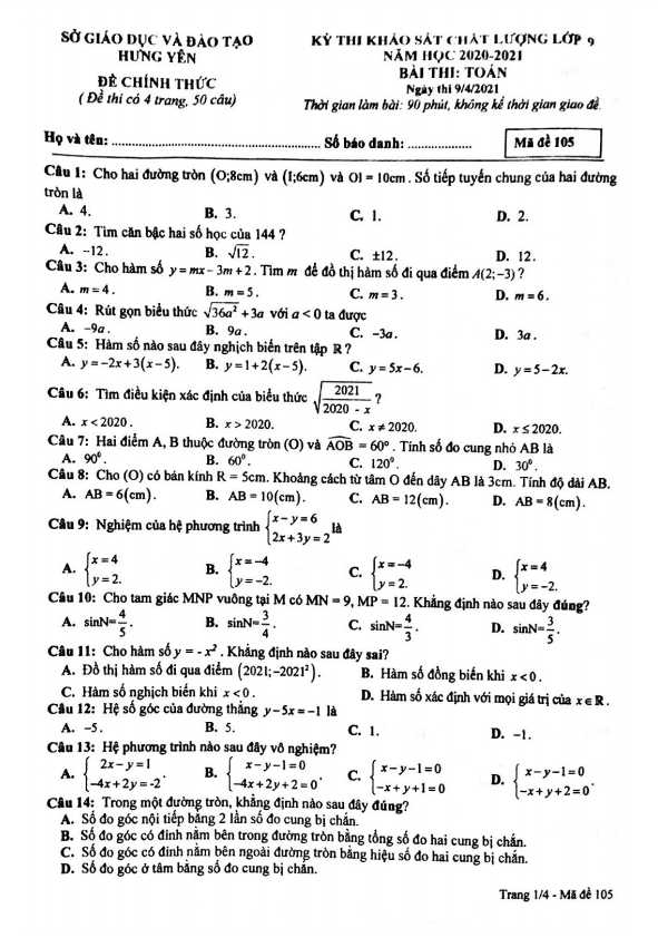 Ngày Thứ Sáu 09 tháng 04 năm 2021, Sở Giáo dục và Đào tạo tỉnh Hưng Yên đã tổ chức kỳ thi khảo sát chất lượng (KSCL) môn Toán cho học sinh lớp 9 trong năm học 2020-2021. Đề thi gồm 50 câu trắc nghiệm, được in trên 4 trang với mã đề 105, thời gian làm bài là 90 phút.