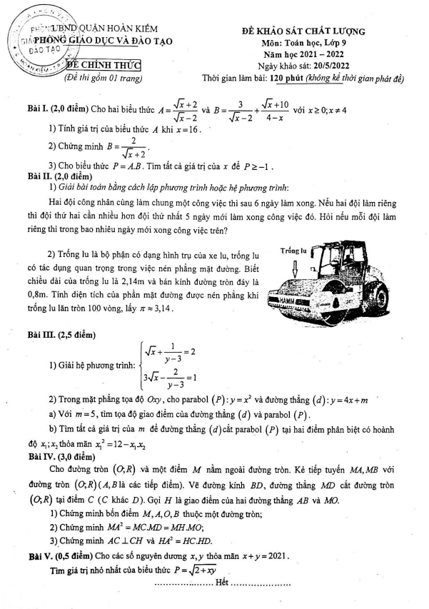 Xin chào quý thầy cô giáo và các em học sinh lớp 9! Hôm nay, chúng ta sẽ cùng điểm qua nội dung của đề khảo sát chất lượng môn Toán lớp 9 năm học 2021-2022 do phòng Giáo dục và Đào tạo quận Hoàn Kiếm, thành phố Hà Nội tổ chức vào ngày 20 tháng 05 năm 2022.
