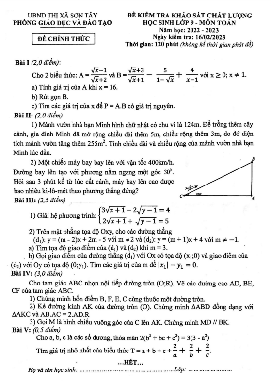 Đề khảo sát chất lượng lớp 9 môn Toán năm 2022-2023 phòng GD ĐT Sơn Tây Hà Nội