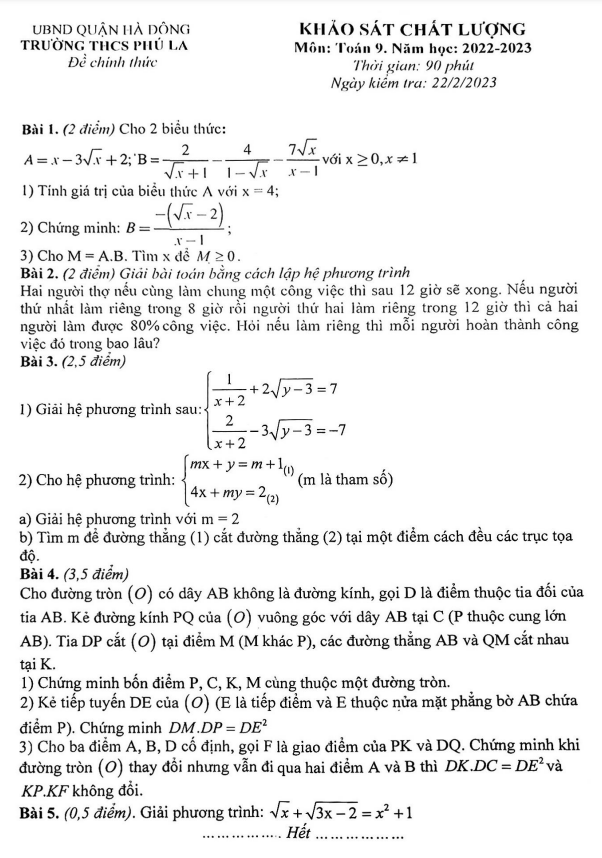 Xin chào quý thầy cô và các em học sinh lớp 9! Để giúp các em chuẩn bị tốt cho kỳ thi khảo sát chất lượng môn Toán, trường THCS Phú La Hà Nội đã tổ chức đề khảo sát vào ngày 22 tháng 02 năm 2023.