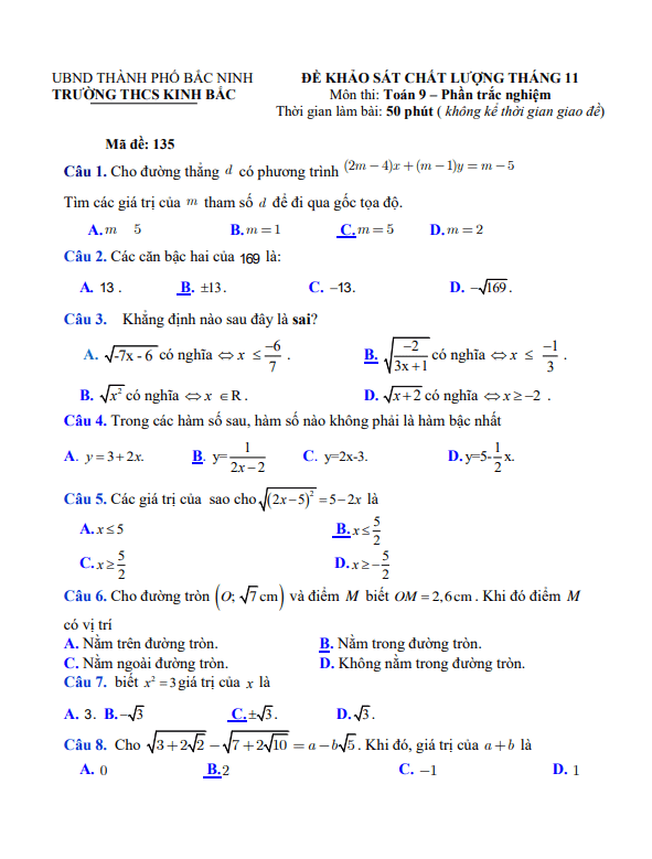 Đề khảo sát chất lượng môn Toán lớp 9 tháng 11 năm 2021 trường THCS Kinh Bắc Bắc Ninh