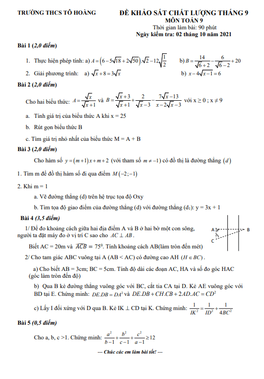 Đề khảo sát chất lượng lớp 9 môn Toán tháng 9 năm 2021 trường THCS Tô Hoàng Hà Nội