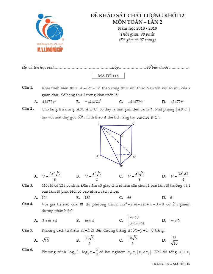 **Đề khảo sát chất lượng Toán lớp 12 năm 2018 – 2019 trường M.V Lômônôxốp – Hà Nội lần 2**Đề khảo sát chất lượng Toán lớp 12 năm 2018 – 2019 trường M.V Lômônôxốp – Hà Nội lần 2 là một bài thi được biên soạn và tổ chức để kiểm tra năng lực của học sinh trong giai đoạn giữa học kỳ 1. Mục đích của đề thi không chỉ là để đánh giá chất lượng học tập mà còn để giúp học sinh ôn tập và chuẩn bị cho kỳ thi THPT Quốc gia môn Toán năm 2019.Đề thi bao gồm 7 trang với tổng cộng 50 câu hỏi và bài toán trắc nghiệm khách quan. Thời gian làm bài cho học sinh là 90 phút. Các câu hỏi được lấy từ chương trình Toán của lớp 10, lớp 11 và lớp 12, bao gồm các nội dung như tọa độ mặt phẳng Oxy, công thức lượng giác, vectơ, tổ hợp và xác suất, giới hạn, đạo hàm, hàm số và đồ thị, mũ và logarit, khối đa diện và thể tích. Điều này giúp học sinh luyện tập và củng cố kiến thức để chuẩn bị cho kỳ thi quan trọng sắp tới.Một số câu hỏi mẫu trong đề khảo sát bao gồm:- Tính số năm cần để một số tiền gửi tiết kiệm tăng lên đến 884 triệu đồng với lãi suất cố định hàng tháng.- Khẳng định đúng về tiệm cận của đồ thị hàm số y = f(x) khi x tiến đến vô cùng.- Tính thể tích khối lăng trụ dựa trên thông tin về các đường kính và khoảng cách.Đề thi cung cấp đáp án và lời giải chi tiết để giúp học sinh tự kiểm tra và tự ôn tập sau khi hoàn thành bài thi. Qua đó, học sinh có thêm cơ hội nâng cao kiến thức và kỹ năng giải bài toán, từ đó tự tin hơn khi tham gia kỳ thi THPT Quốc gia.