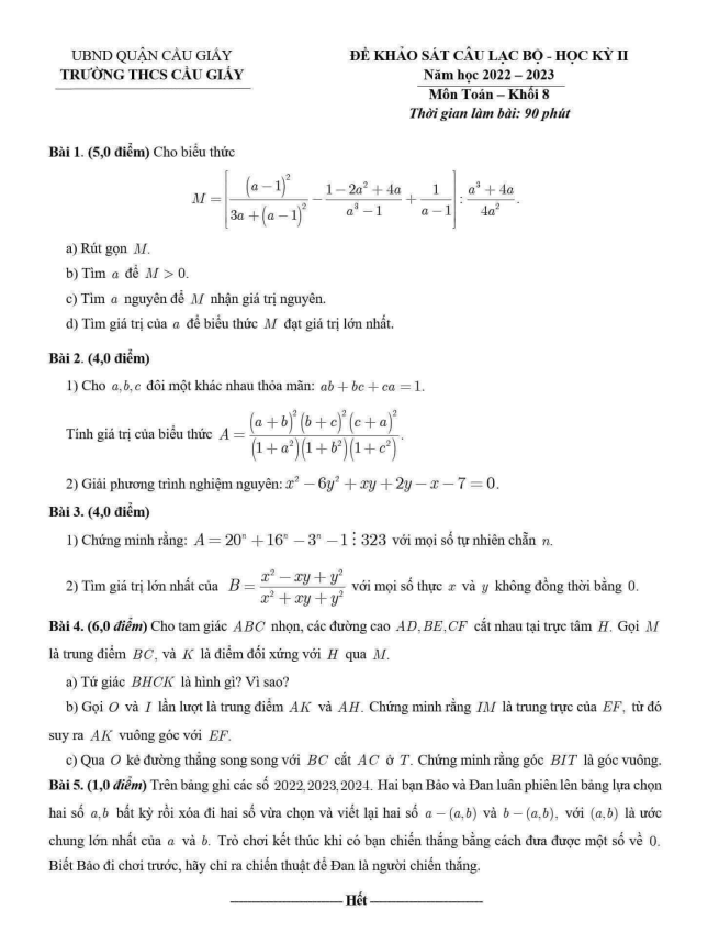 Trích dẫn đề khảo sát CLB Toán lớp 8 năm 2022 – 2023 trường THCS Cầu Giấy – Hà Nội:
