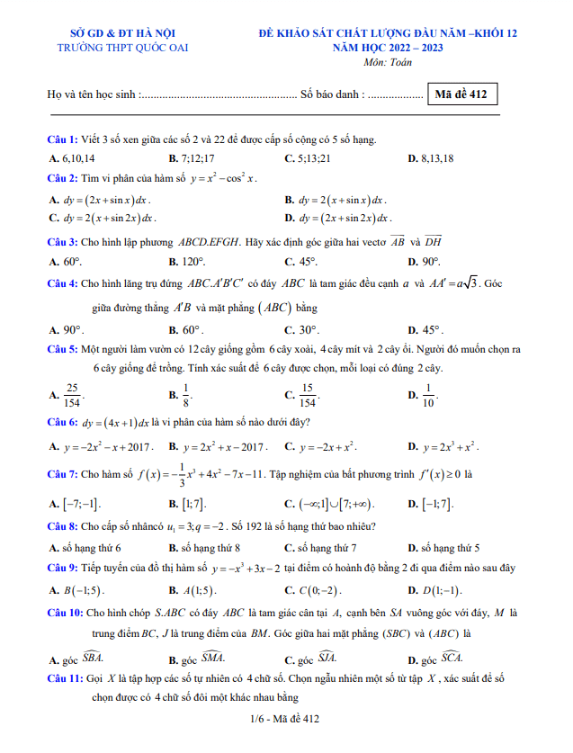 Đề khảo sát chất lượng đầu năm môn Toán lớp 12 năm học 2022 – 2023 tại trường THPT Quốc Oai, Hà Nội (mã đề 412) được thiết kế để đánh giá năng lực và kiến thức của học sinh lớp 12 trong môn Toán. Đề khảo sát bao gồm các bài toán và câu hỏi đa dạng, giúp học sinh rèn luyện kỹ năng tư duy logic và phân tích vấn đề.