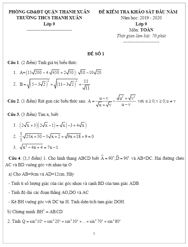 Đề khảo sát đầu năm lớp 9 môn Toán năm 2019-2020 trường Thanh Xuân Hà Nội