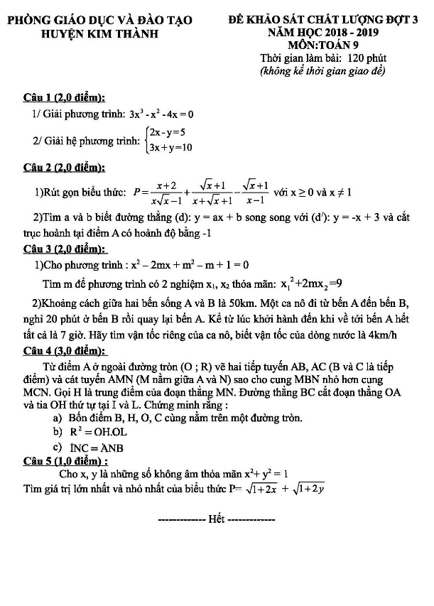 Đề khảo sát đợt 3 Toán lớp 9 năm 2018 – 2019 phòng GD&ĐT Kim Thành – Hải Dương gồm 01 trang với 05 bài toán dạng đề tự luận, thời gian làm bài là 120 phút.