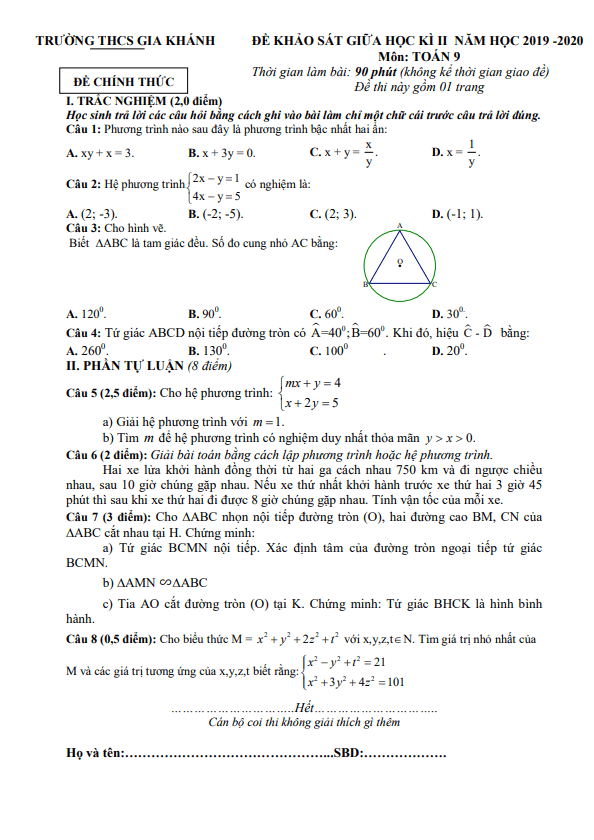 Đề khảo sát giữa kỳ 2 Toán lớp 9 năm 2019 – 2020 tại trường THCS Gia Khánh – Vĩnh Phúc mang lại cho học sinh cơ hội thử thách kiến thức và kỹ năng trong môn Toán, đồng thời giúp họ rèn luyện khả năng tư duy logic và sự sáng tạo trong giải quyết vấn đề.