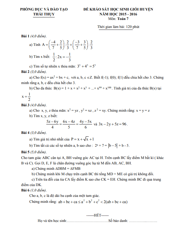 Đề khảo sát HSG huyện lớp 7 môn Toán năm 2015-2016 phòng GD ĐT Thái Thụy Thái Bình