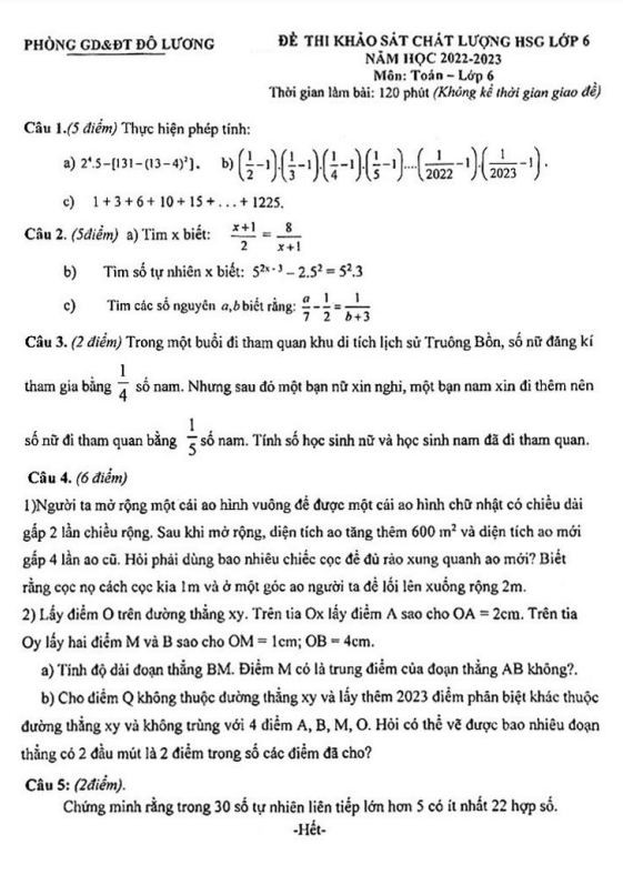 Đề khảo sát HSG môn Toán lớp 6 năm 2022-2023 phòng GD&ĐT Đô Lương, Nghệ An