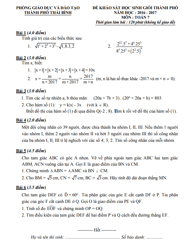 Chi tiết đề khảo sát HSG Toán lớp 7 năm 2016 – 2017 phòng GD&ĐT thành phố Thái Bình: