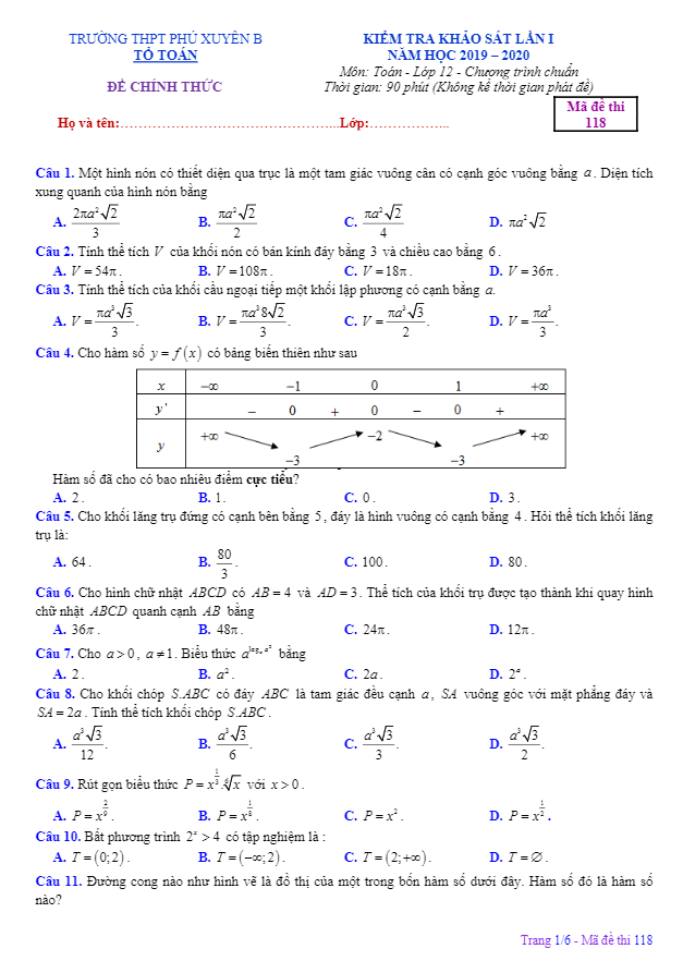 Đề khảo sát lần 1 môn Toán lớp 12 năm 2019 – 2020 của trường THPT Phú Xuyên B – Hà Nội là một bài kiểm tra quan trọng để đánh giá khả năng học tập của học sinh khối 12. Đề thi gồm 50 câu được chia thành 6 trang, học sinh có 90 phút để hoàn thành bài kiểm tra. Đề thi có đáp án mã đề 118, 211, 317, 412 để giúp học sinh tự kiểm tra và đánh giá kết quả của mình sau khi làm bài.Các câu hỏi trong đề khảo sát lần 1 Toán lớp 12 đề cập đến nhiều vấn đề cụ thể và đòi hỏi học sinh phải có kiến thức sâu về môn Toán. Ví dụ, trong đề thi có câu hỏi về đạo hàm của hàm số, về tìm giá trị cực trị của hàm số, về vấn đề xác định số tiền lãi sau khi gửi tiết kiệm trong một khoảng thời gian nhất định, về tính toán diện tích hình vuông và hình tròn, và về tính chất của các đường thẳng và đồ thị hàm số.Đề khảo sát lần 1 môn Toán lớp 12 năm 2019 – 2020 THPT Phú Xuyên B – Hà Nội không chỉ đánh giá khả năng giải bài toán mà còn thúc đẩy học sinh phải suy nghĩ logic, sáng tạo và phân tích để giải quyết các vấn đề phức tạp. Việc làm bài kiểm tra này không chỉ giúp học sinh củng cố kiến thức mà còn giúp họ phát triển kỹ năng giải quyết vấn đề và tự học hiệu quả hơn.