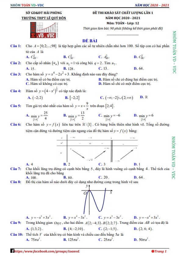 Đề khảo sát chất lượng lần 1 môn Toán lớp 12 năm học 2020 – 2021 trường THPT Lê Quý Đôn – Hải Phòng đã được công bố với đáp án và lời giải chi tiết. Bài thi bao gồm các bài toán phức tạp và đa dạng để kiểm tra năng lực của học sinh.