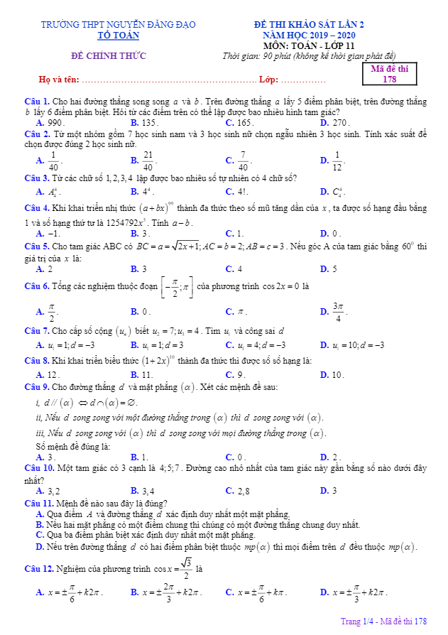 Sytu xin được giới thiệu đến quý thầy cô giáo và các em học sinh khối 11 đề khảo sát lần 2 môn Toán lớp 11 năm học 2019-2020 tại trường Nguyễn Đăng Đạo ở Bắc Ninh. Bài thi gồm 50 câu trắc nghiệm, có mã đề 178 và thời gian làm bài là 90 phút. Kỳ thi này nhằm mục đích kiểm tra chất lượng học tập Toán của học sinh lớp 11 trong giai đoạn đầu của học kỳ 2.