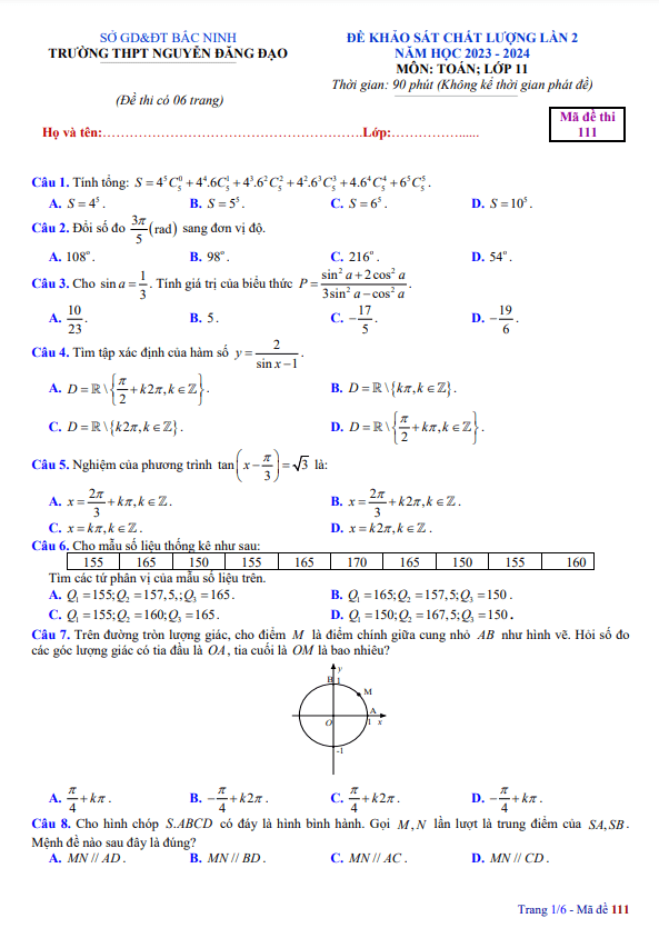 Sytu xin gửi đến quý thầy, cô giáo và các em học sinh lớp 11 đề khảo sát chất lượng lần 2 môn Toán lớp 11 năm học 2023-2024 trường THPT Nguyễn Đăng Đạo, tỉnh Bắc Ninh. Đề thi có mã đề 111, bao gồm 50 câu trắc nghiệm trên 6 trang, thời gian làm bài là 90 phút.