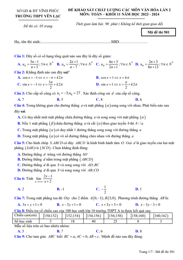 Xin chào quý thầy cô giáo và các em học sinh lớp 11! Hôm nay Sytu xin giới thiệu đến các bạn đề khảo sát chất lượng lần 2 môn Toán lớp 11 năm học 2023 – 2024 của trường THPT Yên Lạc, tỉnh Vĩnh Phúc. Bộ đề thi này đã được biên soạn kỹ lưỡng, phản ánh đầy đủ kiến thức và kỹ năng mà các em đã học trong suốt thời gian qua.