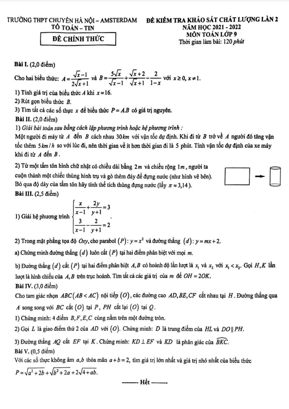Chào đón quý thầy cô và các em học sinh lớp 9! Đề kiểm tra khảo sát chất lượng lần 2 môn Toán lớp 9 năm học 2021 – 2022 trường chuyên Hà Nội – Amsterdam đã được tổ chức. Đề khảo sát gồm các câu hỏi sau: