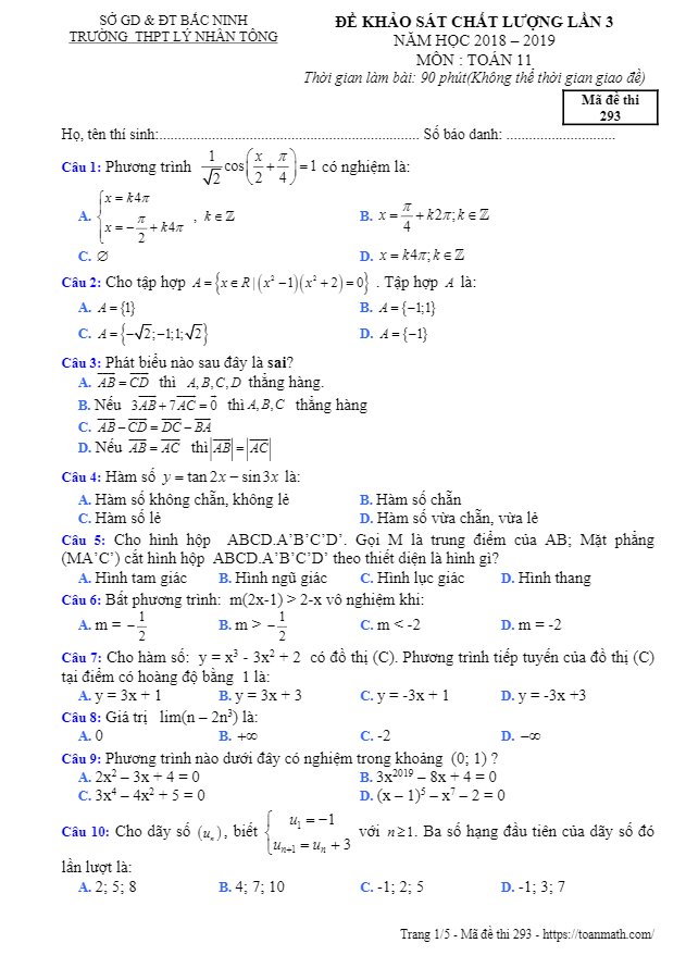 Trong một nỗ lực kiểm tra đánh giá thường xuyên chất lượng học tập môn Toán của học sinh khối 11, trường THPT Lý Nhân Tông – Bắc Ninh đã tổ chức kỳ thi khảo sát chất lượng Toán lớp 11 năm học 2018 – 2019 lần thứ 3. Đề khảo sát Toán lớp 11 lần 3 năm 2018 – 2019 trường Lý Nhân Tông – Bắc Ninh được mã đề 293 gồm 05 trang và được biên soạn dưới dạng trắc nghiệm với 50 câu và 04 đáp án A, B, C, D, học sinh được 90 phút để hoàn thành bài thi khảo sát.