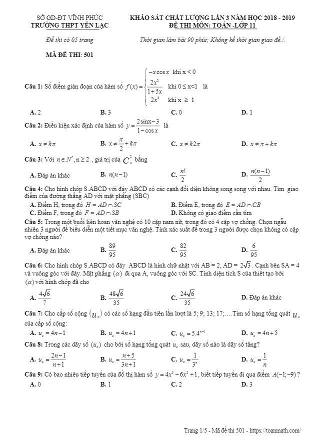 Trích dẫn một số câu hỏi trong đề khảo sát Toán lớp 11 lần 3 năm 2018 – 2019 trường THPT Yên Lạc – Vĩnh Phúc: