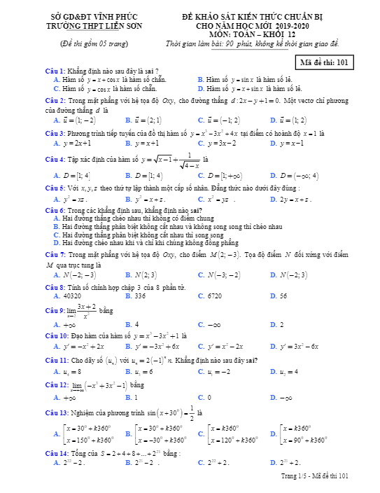 Để giúp học sinh lớp 12 ôn lại kiến thức Toán trước khi bước vào năm học mới, trường THPT Liễn Sơn, Vĩnh Phúc đã tổ chức kỳ thi khảo sát kiến thức đầu năm môn Toán lớp 12 cho năm học 2019 – 2020. Đề khảo sát có mã đề 101, bao gồm 05 trang với 50 câu hỏi và bài toán thuộc chương trình Toán lớp 10, 11. Thời gian làm bài thi là 90 phút.