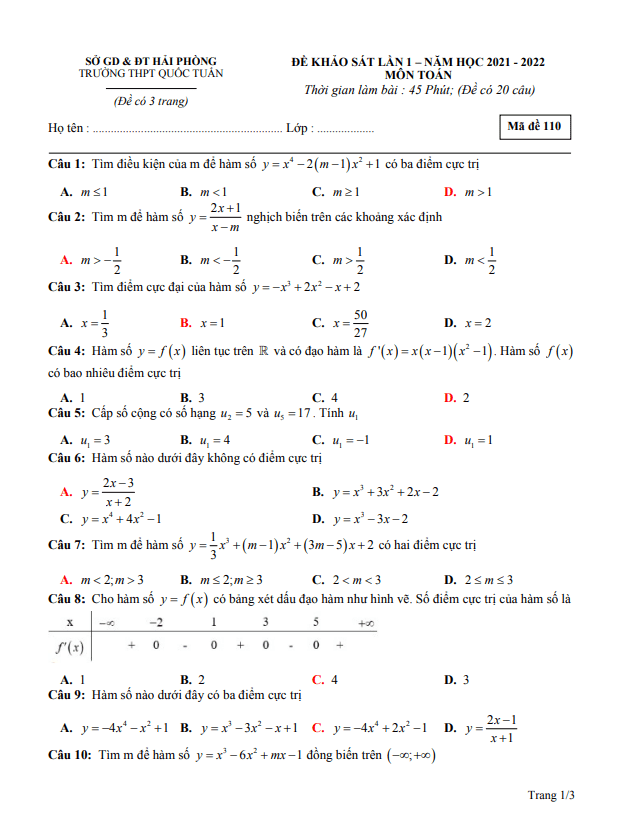 Đề khảo sát lớp 12 môn Toán lần 1 năm 2021 2022 trường THPT Quốc Tuấn Hải Phòng
