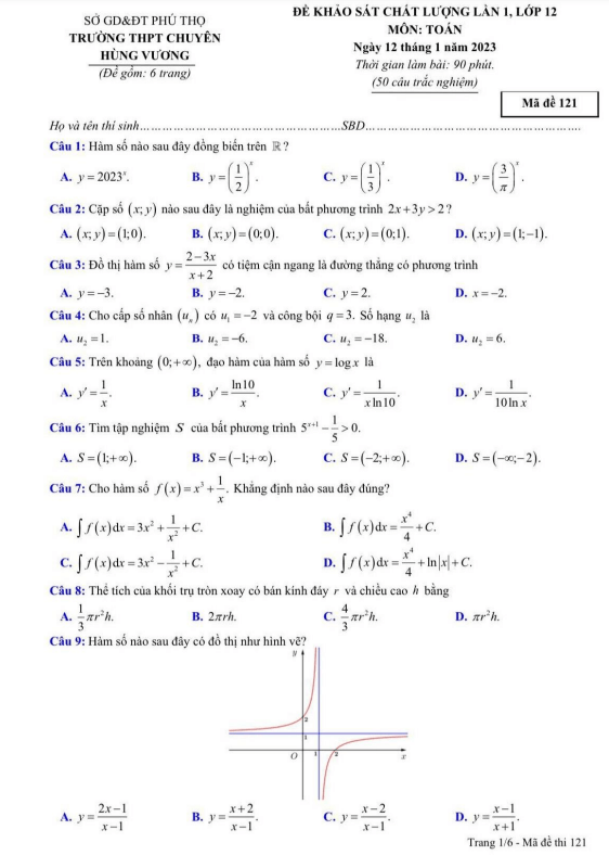 Xin chào quý thầy cô và các em học sinh lớp 12! Hôm nay, chúng ta sẽ cùng nhau tìm hiểu về đề thi khảo sát chất lượng môn Toán lớp 12 lần 1 năm học 2022 – 2023 của trường chuyên Hùng Vương, tỉnh Phú Thọ (mã đề 121). Đề thi này sẽ diễn ra vào ngày 12 tháng 01 năm 2023.