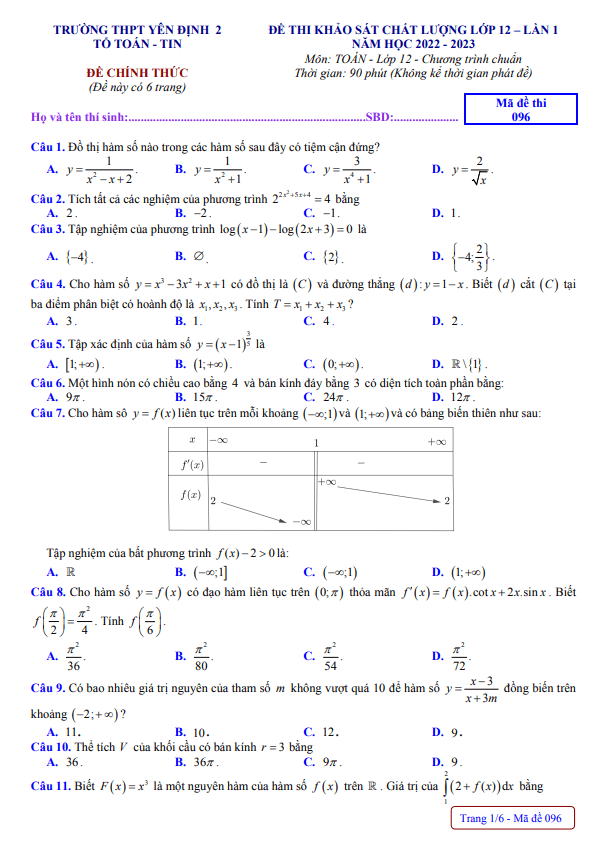 Đề khảo sát lớp 12 môn Toán lần 1 năm 2022 2023 trường THPT Yên Định 2 Thanh HóaChào đón quý thầy, cô giáo và các em học sinh lớp 12! Đây là đề thi khảo sát chất lượng môn Toán lớp 12 (theo chương trình chuẩn) lần 1 năm học 2022-2023 của trường THPT Yên Định số 2, Thanh Hóa. Đề thi này có mục tiêu kiểm tra kiến thức Toán tổng quát của học sinh lớp 12, giúp các em rèn luyện và chuẩn bị cho kì thi tốt nghiệp Trung học Phổ thông năm 2023. Đề thi bao gồm mã đề 096 và có đáp án.Một trong số câu hỏi trong đề thi đó là: “Ông Nam cần xây một bể đựng nước mưa có thể tích 3m^3 8 dạng hình hộp chữ nhật với chiều dài gấp 4 lần chiều rộng, đáy và nắp đổ bê tông, cốt thép; xung quanh xây bằng gạch và xi măng. Biết chi phí trung bình là 980.000 đ/m^2 và ở nắp để hở một khoảng hình vuông có diện tích bằng 2/9 diện tích nắp bể. Hãy tính chi phí thấp nhất mà ông Nam phải chi trả (làm tròn đến hàng nghìn).” (Câu hỏi A, B, C, D)Câu hỏi tiếp theo đề cập đến giá trị nhỏ nhất của một biểu thức và tính tỉ lệ của thể tích khi chia khối lăng trụ tam giác ra 2 phần. (Câu hỏi B, C)Để xem đầy đủ nội dung và chi tiết hơn, vui lòng tải file WORD theo đường link sau: [link tải]. Hy vọng rằng đề thi sẽ giúp các em học sinh lớp 12 tự tin và chuẩn bị tốt cho kỳ thi quan trọng sắp tới. Chúc quý thầy, cô và các em thành công trong hành trình học tập và thi cử sắp tới!