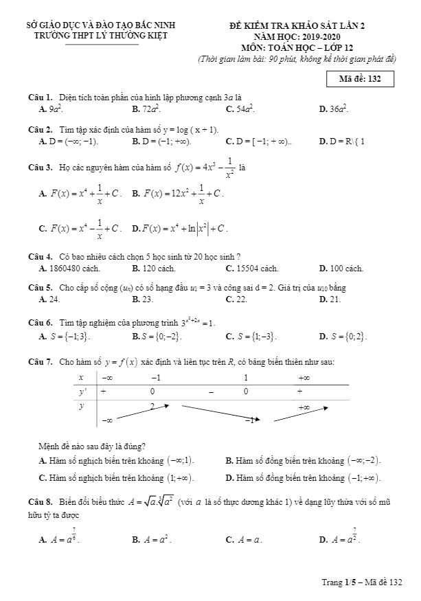 Đề khảo sát Toán lớp 12 lần 2 năm 2019 – 2020 trường THPT Lý Thường Kiệt Bắc Ninh