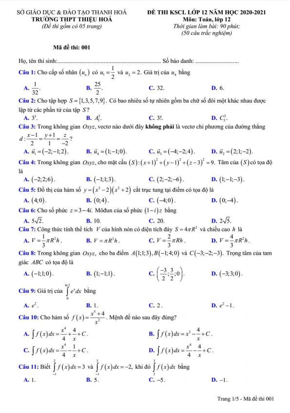Đề khảo sát Toán lớp 12 năm 2020-2021 trường THPT Thiệu Hóa Thanh Hóa