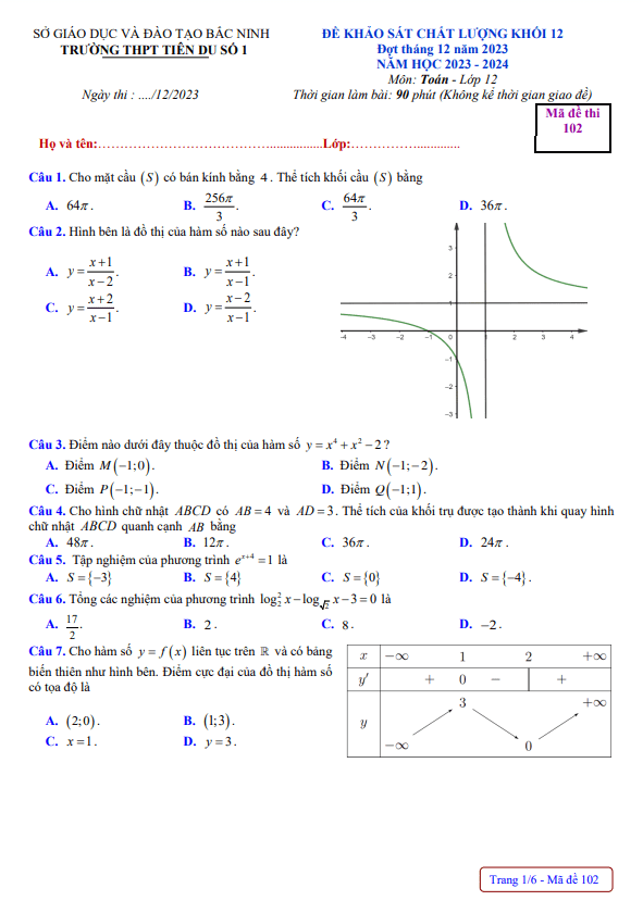Chào quý thầy cô và các em học sinh lớp 12! Sytu xin giới thiệu đến các bạn bộ đề khảo sát chất lượng môn Toán lớp 12 tháng 12 năm 2023 của trường THPT Tiên Du số 1, tỉnh Bắc Ninh. Đề thi bao gồm mã đề 101 – 102 – 103 – 104, với đầy đủ đáp án trắc nghiệm để giúp các em ôn tập và kiểm tra kiến thức.Để cho mọi người dễ hiểu hơn về nội dung đề khảo sát, chúng ta hãy cùng phân tích các bài toán trong đề thi nhé:1. Bài tập về hình chóp S.ABCDEF: Bài toán yêu cầu tính tỉ số thể tích giữa hai khối chóp S.AHKMNF và S.ABCDEF. Đề bài cung cấp các thông tin về hình chóp và các mối quan hệ giữa các điểm trong hình chóp. Hãy chú ý tìm ra quan hệ giữa các đỉnh, cạnh, mặt phẳng để giải quyết bài toán này đúng cách.2. Bài toán về lãi suất ngân hàng: Đề bài yêu cầu bạn tính số năm cần gửi tiền vào ngân hàng với lãi suất nhất định để nhận được tổng số tiền là 300 triệu đồng. Hãy áp dụng công thức tính lãi kép để giải quyết bài toán này một cách chính xác.3. Bài toán về hình trụ: Bài toán đưa ra thông tin về hình trụ, mặt phẳng cắt và hình vuông được tạo thành từ đó. Bạn cần tính thể tích của khối trụ đã cho dựa trên các thông số đã được cung cấp trong đề bài.Hy vọng rằng bộ đề khảo sát Toán lớp 12 tháng 12 năm 2023 sẽ giúp các em ôn tập và chuẩn bị tốt cho kỳ thi sắp tới. Chúc các em đạt kết quả cao và thành công trên con đường học vấn. Cám ơn!