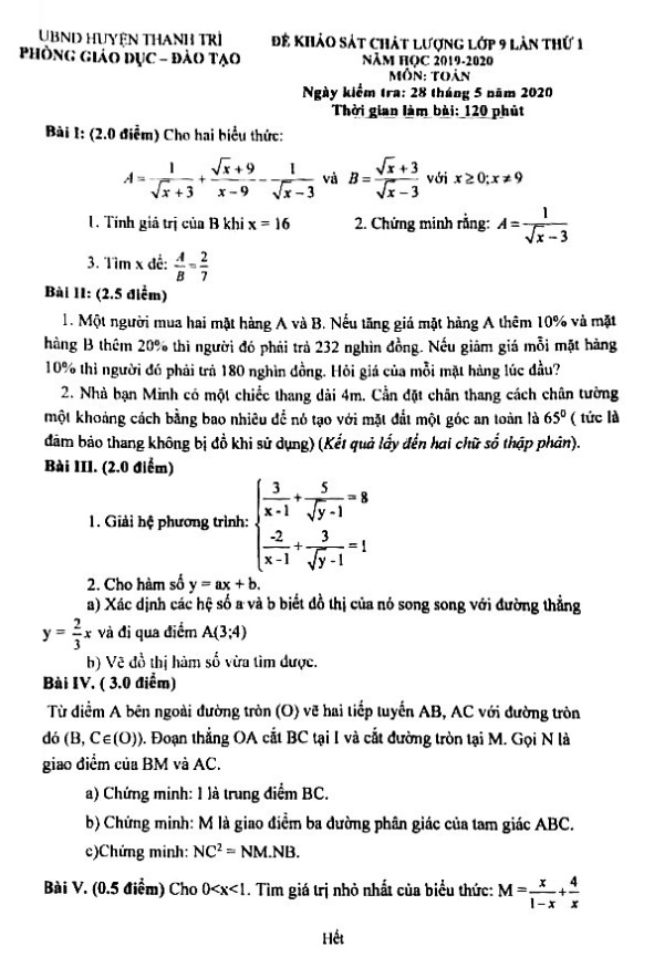Đề khảo sát lớp 9 môn Toán lần 1 năm 2019 2020 phòng GD ĐT Thanh Trì Hà Nội