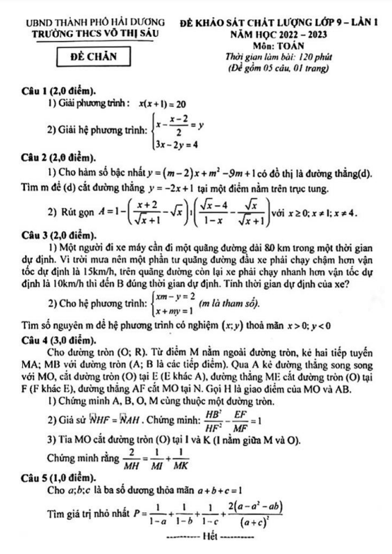 Xin chào quý thầy cô và các em học sinh lớp 9! Hôm nay, chúng ta sẽ cùng nhau tìm hiểu về đề khảo sát chất lượng môn Toán lớp 9 lần 1 năm học 2022 – 2023 tại trường THCS Võ Thị Sáu, tỉnh Hải Dương. Đề thi bao gồm 01 trang với 05 bài toán tự luận, thời gian làm bài là 120 phút.