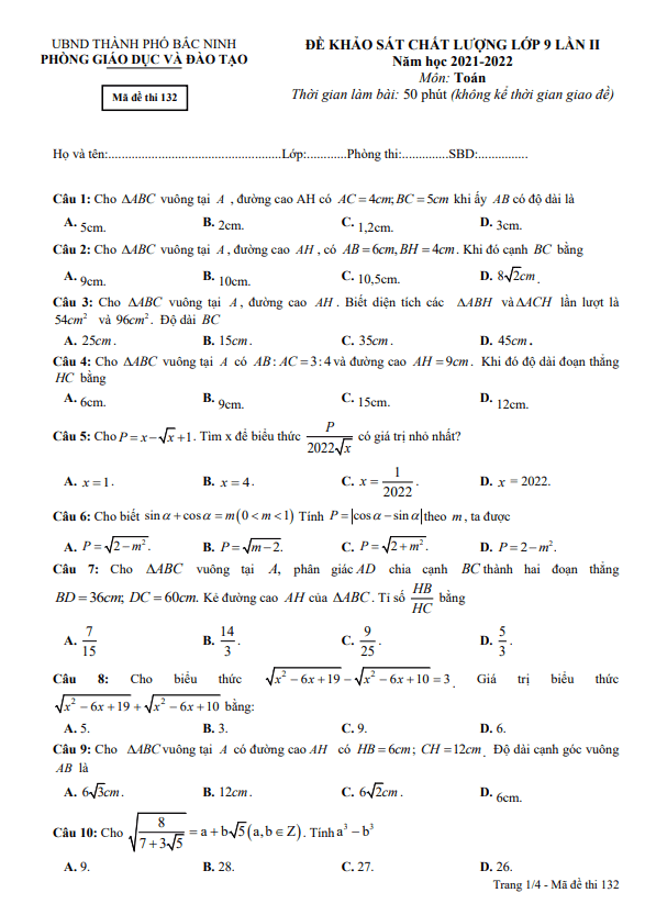 Đề khảo sát Toán lớp 9 lần 2 năm 2021 – 2022 phòng GD&ĐT thành phố Bắc Ninh bao gồm 40 câu trắc nghiệm trải qua 04 trang, thời gian làm bài là 50 phút.